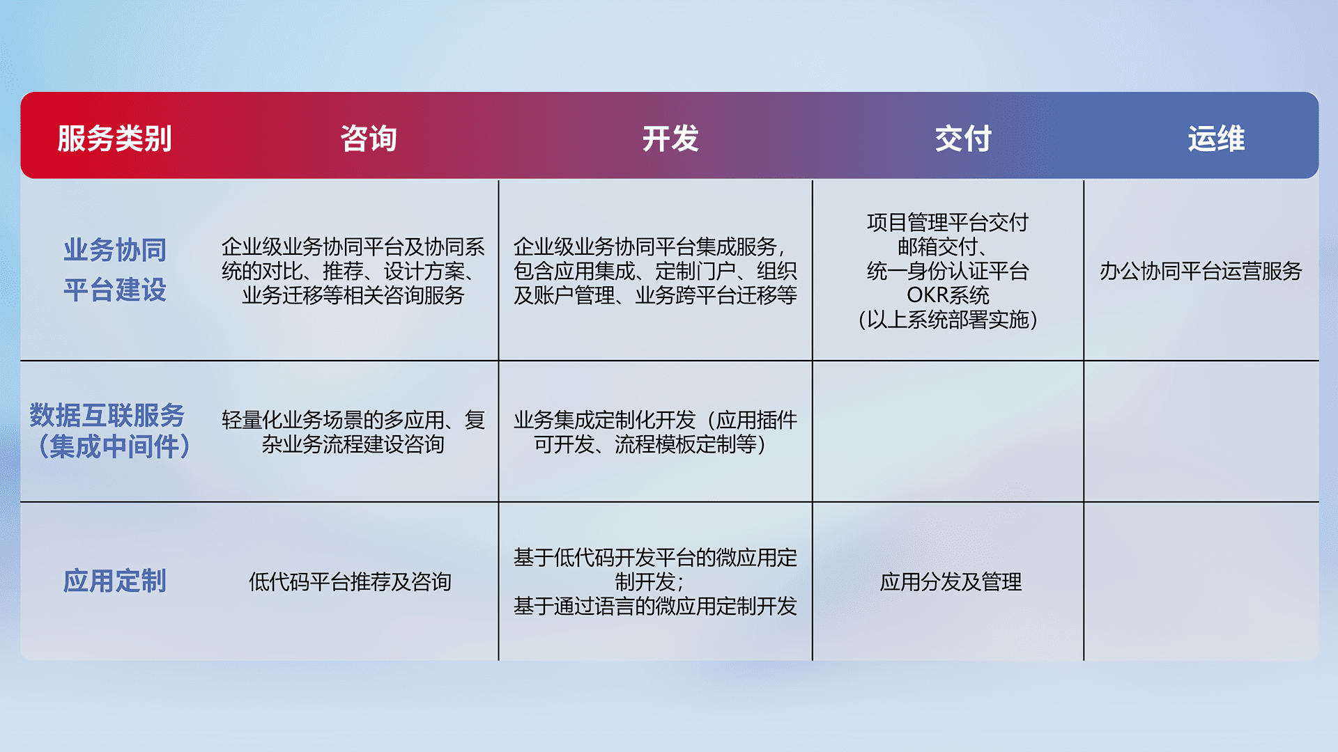 针对钉钉、、、、企微、、、、IDaas等平台级产品提供产品的规划、、方案、、交付、、、、定制化开发等服务,,,,实现如统一协同办公、、智能客户服务、、、混合会议管理、、智能数据查询、、等业务场景,,,实现数字化转型。。。。